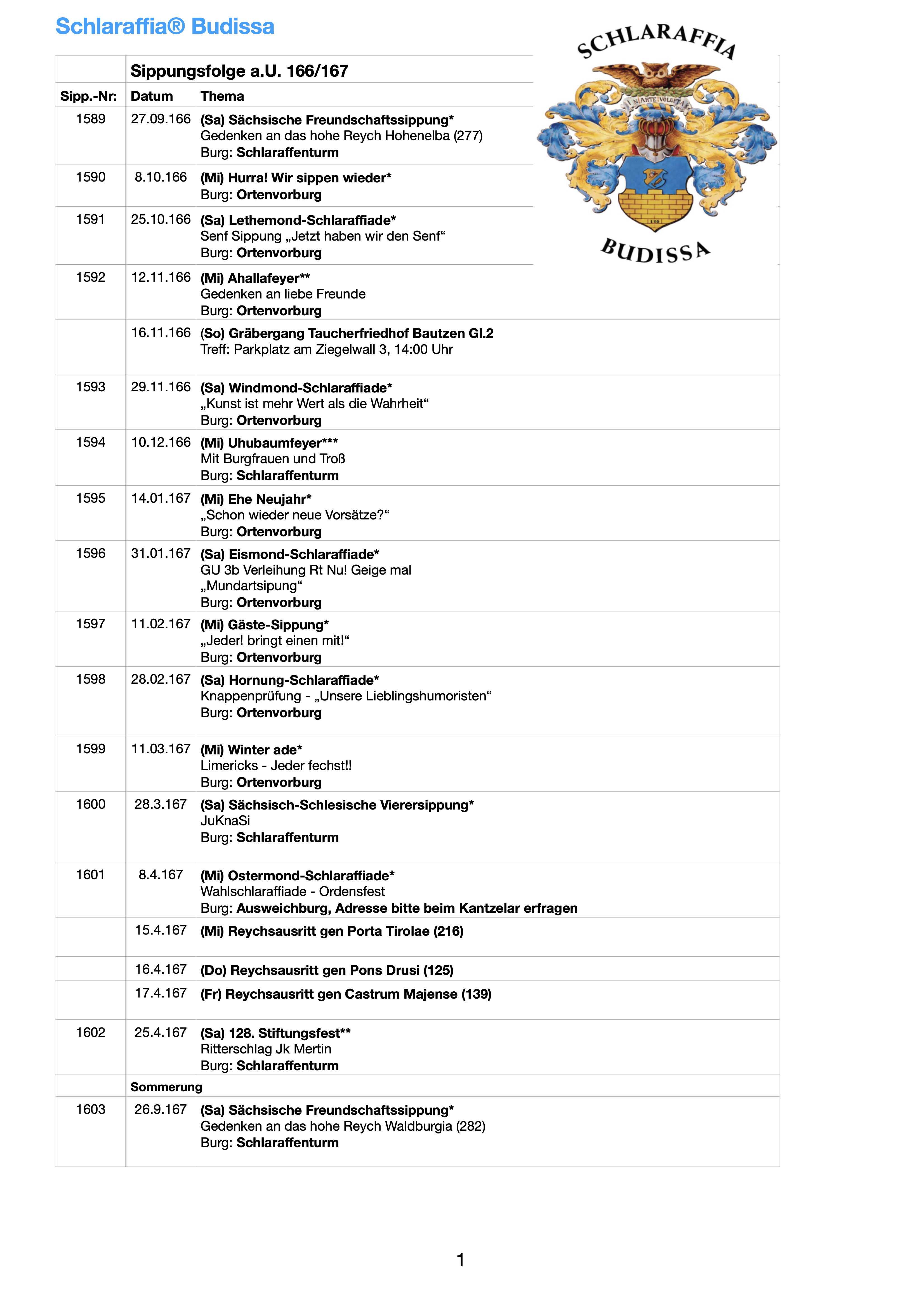 Es wird gebeten, dass jeder Sasse, der einen Einritt in die Budissa plant, sich vorab mit dem Kantzler in Verbindung setzt.